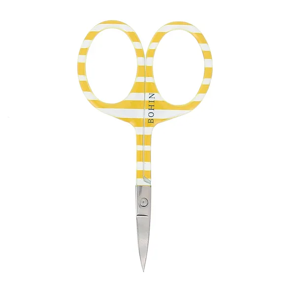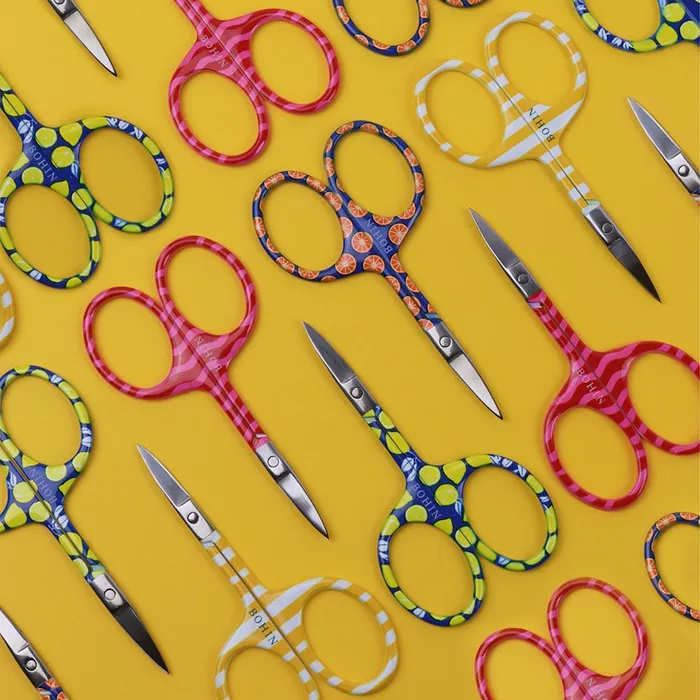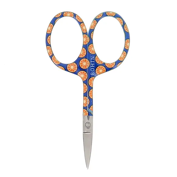 Estas tijeras de bordar Bohin lucen un precioso estampado en los mangos. Su pequeño tamaño y sus hojas afiladas y cuidadosamente acabadas permiten un corte preciso.