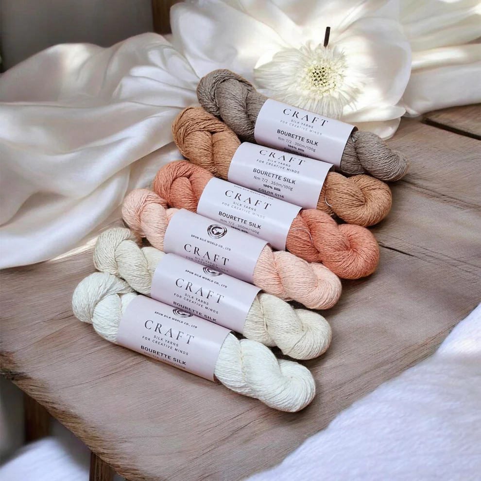 El hilo Bourette se obtiene de las fibras cortas que se encuentran en la periferia del capullo o de los restos de tejido. Hiladas mediante un proceso similar al del algodón , estas fibras producen un hilo mate, ligeramente texturizado, que aporta relieve al punto bobo, al punto elástico o al punto brioche.